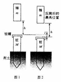 柴油打桩机重锤的质量为m,锤在桩帽以上高度为h处(如图1)从静止开始沿竖直轨道自由落下,打在质量为M(包括桩帽)的钢筋混凝土桩子上。同时,柴油燃烧,产生猛烈推力,锤和桩分离,这一过程的时间极短(此过程可以忽略重力和阻力作用)。随后,桩在泥土中向下移动一距离l。已知锤反跳后到达最高点时,锤与已停下的桩幅之间的距离也为h(如图2)。已知m=1.0×103kg,M=2.0×103kg,h=2.0m,l=0.20m,重力加速度g=10m/s2,混合物的质量不计。设桩向下移动的过程中泥土对桩的作用力F是恒力,求此力的大小。