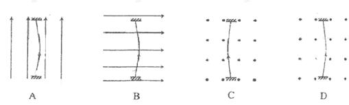 2.一根容易形变的弹性导线,两端固定。导线中通有电流,方向如图中箭头所示。当没有磁场时,导线呈直线状态:当分别加上方向竖直向上、水平向右或垂直于纸面向外的匀强磁场时,描述导线状态的四个图示中正确的是