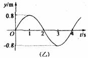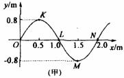 (2)(每空1分,共4分)一列沿着x轴正方向传播的横波,在t=O时刻的波形如图甲所示.图甲中某质点的振动图象如图乙所示.质点N的振幅是 m,振动周期为 s,图乙表示质点 (从质点K、L、M、N中选填)的振动图象,该波的波速为 m/s.