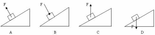 5.物块静止在固定的斜面上,分别按图示的方向对物块施加大小相等的力F,A中F垂直于斜面向上,B中F垂直于斜面向下,C中F竖直向上,D中F竖直向下,施力后物块仍然静止,则物块所受的静摩擦力增大的是 ( )