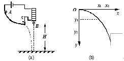 (2)在某次实验中,测得小球A的平抛运动轨迹如图(b)所示,已知O点是小球做平抛运动的抛出点,x1=42cm,y1=19.6cm, y2=44.1cm,可计算出x2=______cm。
