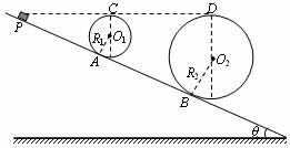 17.(12分)如图所示是游乐场中过山车的模型图。图中半径分别为R1=2.0m和R2=8.0m的两个光滑圆形轨道,固定在倾角为θ=37°斜轨道面上的A、B两点,且两圆形轨道的最高点C、D均与P点平齐,圆形轨道与斜轨道之间圆滑连接.现使小车(视为质点)从P点以一定的初速度沿斜面向下运动.已知斜轨道面与小车间的动摩擦因数为μ=1/6,g=10m/s2,sin37°=0.6,cos37°=0.8.问: