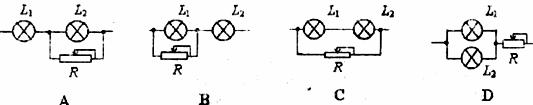 12.如图所示,两只灯泡L1、L2分别标有“110V;60W”和“110V,100W”,另外有一只滑动变阻器R,将它们连接后接入220V的电路中,要求两灯泡都正常发光,并使整个电路消耗的总功率最小,应使用下面哪个电路( )