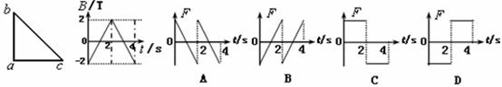 5.三角形导线框abc放在匀强磁场中,磁感线方向与线圈平面垂直,磁感应强度B随时间变化的图像如图所示。t=0时磁感应强度方向垂直纸面向里,则在0-4s时间内,线框的ab边所受安培力随时间变化的图像是如图所示的(力的方向规定向右为正)