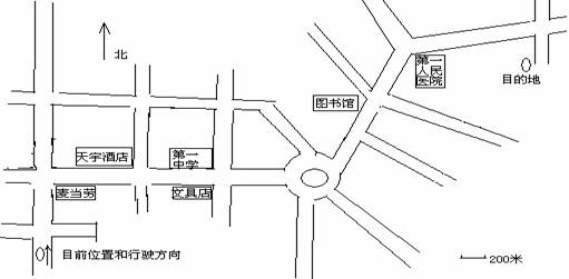 14、假如你的一位朋友要从下图左下角所示的“目前位置”开车到右上角所示的目的地,但他根本不清楚路线,现在请你从下图中选择必要的信息加以组合,给他发一条简洁明了的手机短信,告诉他最佳的行驶路线。(不超过55字。6分)