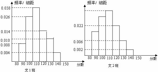 某中学一个高三数学教师对其所教的两个文科班(每班50名学生)的学生的一次数学成绩进行了统计,高三年级文科数学平均分是100分,每个班数学成绩的频率分布直方图如下(总分150分):
