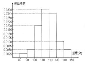 16.某市十所重点中学进行高三联考,共有5000名考生,为了了解数学学科的学习情况,现从中随机抽出若干名学生在这次测试中的数学成绩,制成下图所示的频率分布直方图。据此估计全体考生中120分及以上的学生数为 .