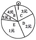 某校有一贫困学生因病需手术治疗,但现在还差手术费1.1万元。团委计划在全校开展爱心募捐活动,为了增加活动的趣味性吸引更多学生参与,特举办“摇奖100%中奖”活动。凡捐款10元便可享受一次摇奖机会,如图是摇奖机的示意图,摇奖机的旋转盘是均匀的,扇形区域A,B,C,D,E所对应的圆心角的比值分别为1:2:3:4:5。相应区域分别设立一、二、三、四、五等奖,奖品分别为价值5元、4元、3元、2元、1元的学习用品。摇奖时,转动圆盘片刻,待停止后,固定指针指向哪个区域(边线忽略不计)即可获得相应价值的学习用品(如图指针指向区域,可获得价值3元的学习用品)。