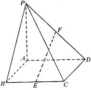 在四棱锥P-ABCD中,PA⊥平面ABCD,底面ABCD为正方形,E、F分别为BC、PD的中点,PA=AB。