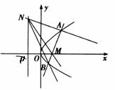 (1)证明:A、B两点的纵坐标之积为定值;(2)若点N是定直线x = –p上的任一点,问三条直线AN、MN、BN的斜率之间是否存在某等量关系,若存在,试写出该等量关系式,并给出证明;若不存在,说明理由。