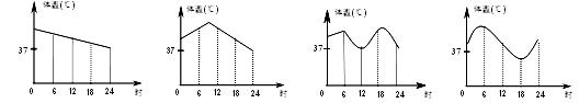 8.一天清晨,某同学生病了,体温上升,吃过药后感觉好多了,中午时他的体温基本正常,但是下午他的体温又开始上升,直到半夜才感觉身上不那么发烫了。下面大致能上反映出该同学这一天(0时-24时)体温的变化情况的图是 ( )