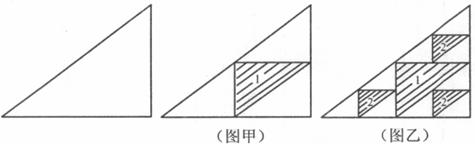 如下图,对一个边长分别为3、4、5的直角三角形进行如下操作:第一次操作,分别连接这个三角形三边的中点,构成4个小三角形,挖去中间一个阴影部分三角形(如图甲);第二次操作,分别连接剩余的三个三角形三边的中点,再挖去各自中间的阴影部分三角形(如图乙);第三次操作,分别连接剩余的各个三角形的中点,再挖去各自中间阴影部分的三角形,……,如此操作下去,记第