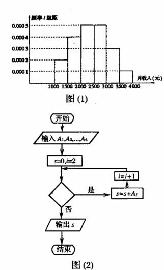 一个社会调查机构就某地居民的月收入(单元:元)调查了10000人,所得数据整理后分成六组,绘制出如图(1)所示的频率分布直方图.记图(1)中从左到右的第一、第二,…,第六组的频数分别为A