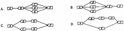10.已知A、B、C、D、E、F代表完成某项工作的六道工序,用时各为5分钟、10分钟、15分钟、20分钟、30分钟、50分钟,则下列工序流程图中用时最少的是 ( )