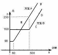 20、(4+6+4)电信局根据市场客户的不同需求,对某地区的手机长途通话费提出两种优惠方案,则两种方案付电话费(元)与通话时间(分钟)之间的关系如图所示(实线部分)(MN平行CD)