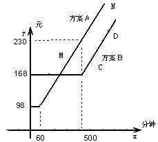 20、(4+6+4)电信局根据市场客户的不同需求,对某地区的手机套餐通话费提出两种优惠方案,则两种方案付电话费(元)与通话时间(分钟)之间的关系如图所示(实线部分)(MN平行CD)