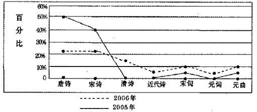 17.下图是2005年与2006年高考古典诗歌测试材料类型比较图,请用简明的文字概括这两年古典诗歌测试所选用材料类型的不同点。(不超过40字)(4分)