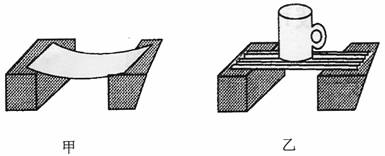 23.有一天,李跃同学手中拿着一张纸条,问班里的同学:“谁能将它搁在两块木块之间?”刘小禾过来试了一下,结果纸条弯曲后滑到下面,如图甲。李跃说:“看我的吧。”说着将纸条折成如图乙所示的形状,放在两个木块之间,并且还在上面放了一只茶杯。相信你对这个实验会感到有趣。请你根据下图中的情景回答下面问题。(4分)