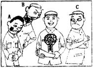 20.仔细观察这幅漫画。分别描述A、B、C三者的神态及心理(对三者的描述分别不 得超过30个字)。(3分)