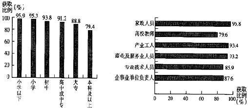 22.下面的图表一和图表二,是有关机构对我国不同群体通过电视获取科技信息情况调查。请根据图表反映的情况,补充下面文段中A、B、C处空缺的内容(不出现数字),使上下文语意连贯。