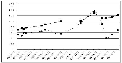 20.下列是近年来我国汽油价格与国际汽油价格(美元/桶)的变化对照图,实线代表国内油价变化情况,虚线代表国际油价变化情况。请根据图示,补充下面文段空缺处的内容(不得出现数字),使上下文语意连贯。(3分)