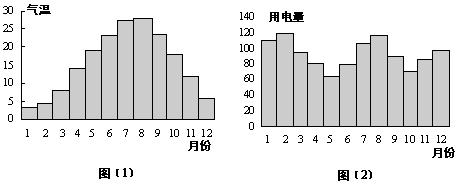 (16)一般地,家庭用电量(千瓦时)与气温(℃)有一定的关系,图(1)表示某年12个月中每月的平均气温,图(2)表示某家庭在这年12个月中每月的用电量,根据这些信息,以下关于该家庭用电量与气温间关系的叙述中,正确的是