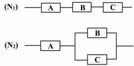 如图,用A、B、C三类不同的元件连接或两个系统N1、N2, 当元件A、B、C都正常工作时,系统N1、N2正常工作; 当元件A正常工作且元件B、C至少有一个正常工作时,系统N2正常工作,已知元件A、B、C正常工作的概率依次为0.80,0.90,0.90。分别求系统N1、N2正常工作的概率P1、P2