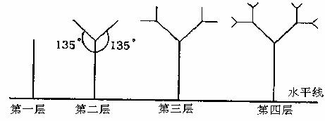 21.(本题满分14分)如图所示的树形图形.第一层是一条与水平线垂直的线段,长度为1;第二层在第一层线段的前端作两条与该段均成1350的线段,长度为其一半;第三层按第二层的方法在每一线段的前端生成两条线段;重复前面的作法作图至第n层.设树形图的第n层的最高点到水平线的距离为第n层树形图的高度.