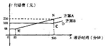 电信局为了配合客户的不同需要,设有A、B两种优惠方案,这两种方案的应付电话费(元)与通话时间(分钟)之间的关系如图所示(实线部分)(注:图中MN//CD).试问