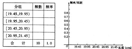 某工厂在两小时内,生产某种产品100件,为了解该产品的长度是否合格,现从中随机抽出10件在同一条件下进行长度测量试验,得到如下样本数据(单位:㎝):20.7,19.7,21.4,20.8,20.3,19.5,20.5,20.6,20.1,19.6。其分组情况如下表: