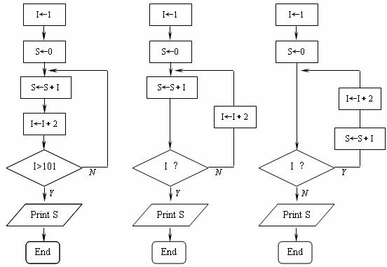 (II)若分别交换三个流程图中S←S+I与I←I+2的位置,应如何调整各框中的条件,使其完成(I)中的算法功能?(不要重画流程图,只需说明修改方案)
