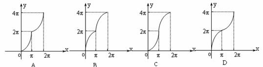 12. 如图,半径为2的⊙O切直线MN于点P,射线PK从PN出发,绕P点逆时针旋转到PM,旋转过程中PK交⊙O于点Q,若∠POQ为x,弓形PmQ的面积为S=f(x),那么f(x)的图象大致是:( )