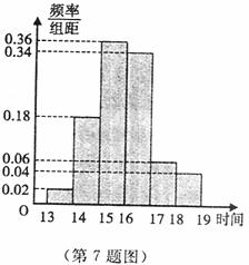 7.某班50名学生在一次百米测试中,成绩全部介于13秒与19秒之间,将测试结果按如下方式分成六组:第一组,成绩大于等于13秒且小于14秒;第二组,成绩大于等于14秒且小于15秒;……;第六组,成绩大于等于18秒且小于19秒。右图是按上述分组方法得到的频率分布直方图。设成绩小于17秒的学生人数占全班总人数的百分比为x,成绩大于等于15秒且小于17秒的学生人数为y,则从频率分布直方图中可分析出x和y分别为( )