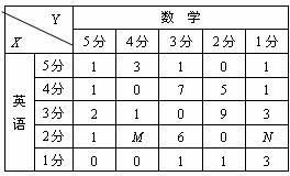 某班50名学生某次测试中的数学、英语成绩采用5分制统计如下表,如:数学5分英语5分的学生1人,若在全班学生中任选一人,且英语成绩记为x,数学成绩记为y.