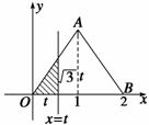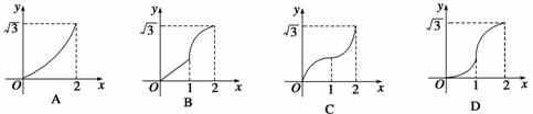 12.如下图所示,在直角坐标系的第一象限内,△AOB是边长为2的等边三角形。设直线x=t(0≤t≤2)截这个三角形可得位于此直线左方的图形的面积为f(t),则函数y=f(t)的图象(如下图所示)大致是 ( )