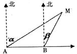 14.如图,一船在海上由西向东航行,在A处测得某岛M的方位角为北偏东α角,前进m(km)后在B处测得该岛的方位角为北偏东β角,已知该岛周围n(km)范围内(包括边界)有暗礁,现该船继续东行,当α与β满足条件 时,该船没有触礁危险。