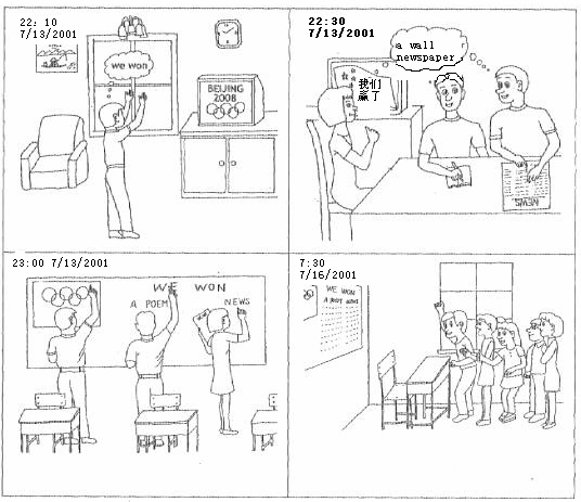 2001年7月13日,你的美国朋友给你写了一封信,祝贺北京申奥成功。收到信后,你给他写了一封回信,介绍了你们是如何庆祝申奥成功的。回信应包括下列图画所示内容,并邀请他在2008年来中国。
