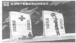 随着经济的高速发展,人民的生活水平大幅度提高。但是普通百姓仍然面临一些现实的问题,成为创建和谐社会的障碍。根据下面的漫画,写一篇120-150词左右的英语短文,说明漫画反映的问题,简要分析其产生的原因,并提出合理化建议。