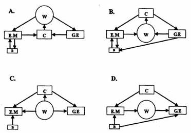 (W----wheel of the car, E:M----electric motor, G.E----gasoline engine, C----computer, B----batteries)