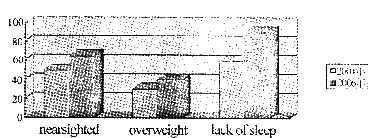 假如下图反映了你们学校2004年与2006年学生健康状况调查的部分百分比数据。请你用英语写一份120一150字的报告,描述各项结果。依次分析原因.并提出相应的建议。第一句已给出(不计入总词数)