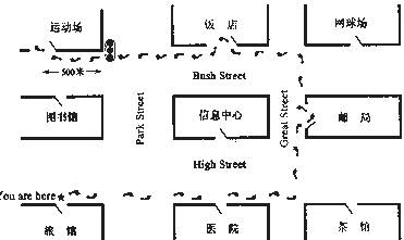 假设你是李华,08年奥运会期间在奥运村做志愿者。一位外国运动员想去邮局买纪念品,然后去饭店吃饭,之后到运动场训练。但因为他对奥运村内环境不熟悉,请你根据下图,按照沿途所经过的主要建筑物及街道的名称等向他介绍相应路线。