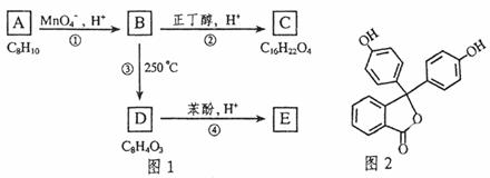 化合物A-E的转化关系如图1所示,已知:A是芳香化合物,只能生成3种一溴化合物,B有酸性,C是常用增塑剂,D是有机合成的重要中间体和常用化学试剂(D也可由其他原料催化氧化得到),E是一种常用的指示剂酚酞,结构如图2。