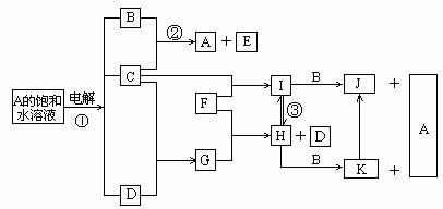 已知:C、D、F均为单质,其中C、D在常温、常压下是气体;反应②是化工生产中的重要反应,生成物E具有漂白性;J、K均为不溶于水的沉淀,其中J为红褐色。