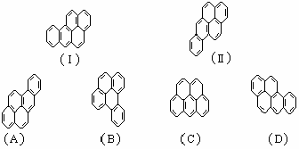 并[α]芘是强致癌物质(存在于烟囱灰、煤焦油、燃烧烟草的烟雾和内燃机的尾气中)。它的分子由五个苯环合并而成,其结构式可以表示(Ⅰ)或(Ⅱ),这两者也是等同的。现有结构式(A)-(D),其中