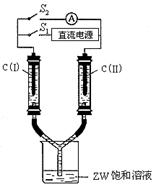 (3)如右图所示装置,两玻璃管中盛满滴有酚酞溶液的ZW饱和溶液,C(I)、C(II)为多孔石墨电极。接通S1后,C(I)附近溶液变红,两玻璃管中有气体生成。一段时间后(两玻璃管中液面未脱离电极),断开S1,接通S2,电流表的指针发生偏转。此时C(I)的电极名称是 (填写正极或负极); C(II)的电极反应式是 。