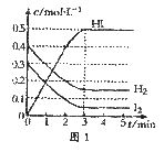 2HI(g) △H<O。反应中各物质的浓度随时间变化情况如图l所示。