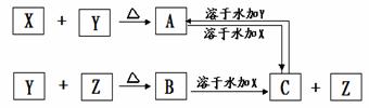 (12分)X、Y、Z为常见的三种单质,常温下X为固体,Y是液体,Z是无色气体。其反应关系如下图所示,其中B的溶液显强酸性。