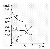 (3)若乙在水溶液呈弱碱性,并可用作农业化肥,D常况下为气体,则进行下列研究: 现将0.40 mol C和0.20 mol D充入10L的密闭容器中,在一定条件下使其发生反应,有关C、D、乙三者的物质的量的变化与时间的关系如右图所示: