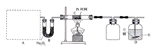 按上图连接好各仪器,先将C处Pt丝网加热至红热,再将A处产生的气体通过B装置片刻后撤去C处酒精灯。部分实验现象如下:Pt丝继续保持红热,D中Cu片慢慢溶解。回答下列问题: