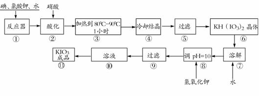 碘酸钾是一种白色结晶粉末,无臭无味,酸性条件下碘酸钾是一种较强的氧化剂,与氢碘酸、二氧化硫等还原性物质作用,被还原为单质碘,在碱性介质中,碘酸钾能被氯气、次氯酸盐等氧化为高碘酸钾。碘酸钾在常温下稳定,加热至560℃开始分解。工业生产碘酸钾的流程如下,在反应器中发生反应的化学方程式为:
